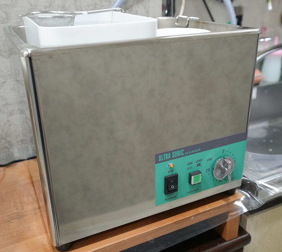 使用後の器具はまず丁寧に手洗いを行い、その後、超音波洗浄機で細かな汚れまでしっかり除去。さらに、オートクレーブ(高圧蒸気滅菌器)で完全に滅菌してから使用しています。